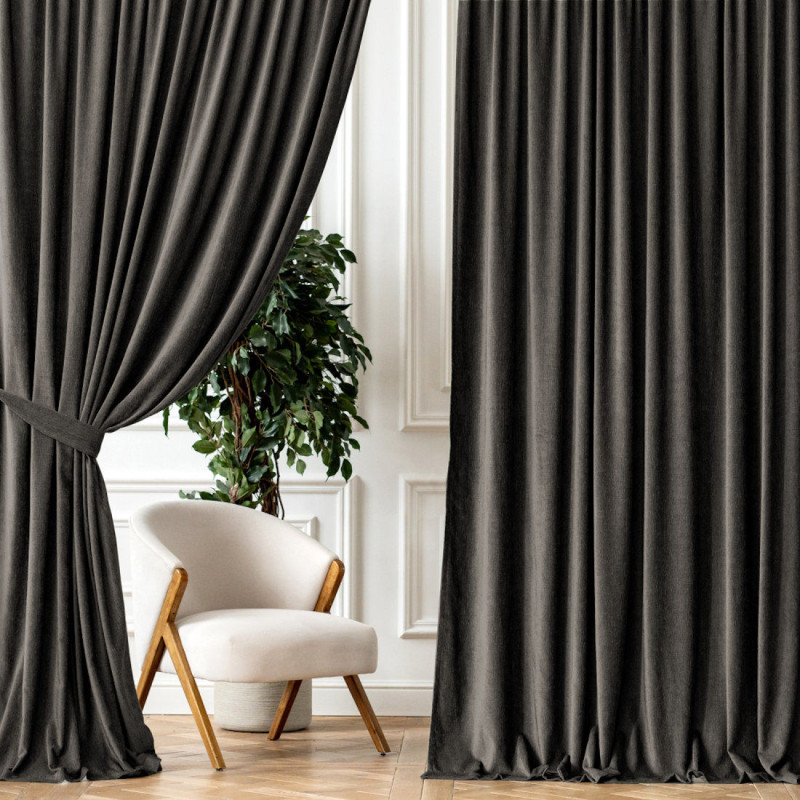 Шторы шенил Sharm в цвете антрацита имеют нежную фактуру и среднюю плотность, что обеспечивает эффективное затемнение до 70%. Это идеально подходит для спальных комнат и гостиных, где комфорт и уют являются приоритетом.