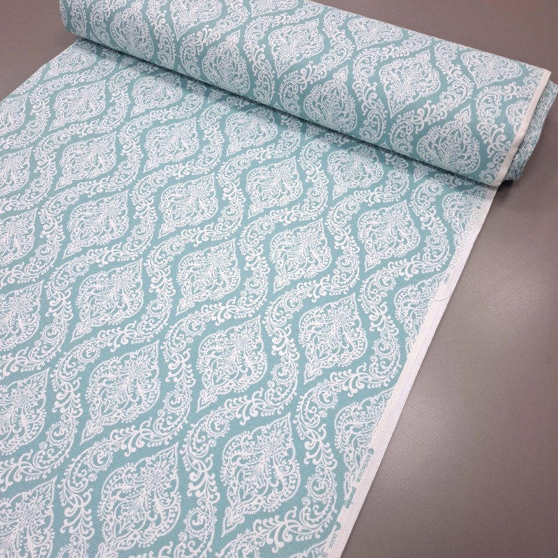 Скатертинна тканина з просоченням Вензель лазурний середньої щільності, м'яка і приємна за тактильними відчуттями, яскравий принт відмінно підійде для пошиття скатертин і штор, для цікавого дизайну рекомендуємо поєднувати з однотонними тканинами. Штори з цієї тканини виглядають натурально з великим вмістом бавовни, матеріал безпечний, гіпоалергенний не збирає пилу, завдяки захисту з тефлону стійкий до бруду.