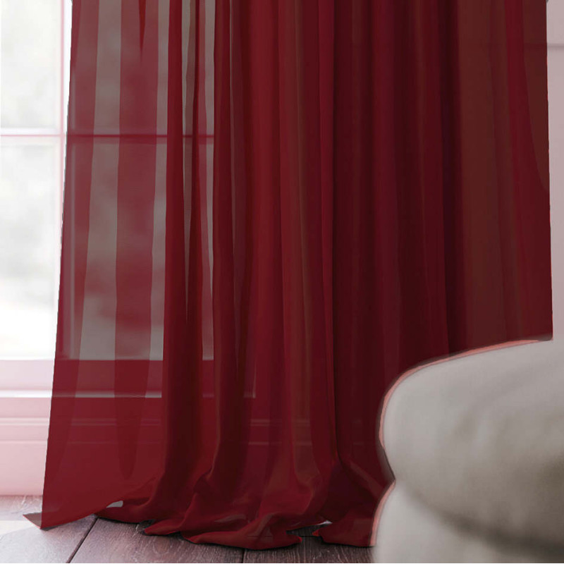 Готовий тюль вуаль Alana бордовий 500*270 см пошитий з популярної тканини вуаль білого кольору без синього відливу, структура тканини дуже схожа на шифон, основними перевагами є прозорість і практично матова структура. Зверху на тюль пришита прозора тасьма під гачки, а бічні рядки та низ зроблений з еталонним рівнем якості.